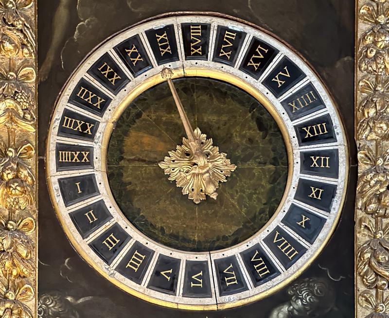 Finally, the Chamber of the State Advocacies (i.e., the lawyers’ room) in the Doge’s Palace has this clock in the room for lawyers. Like the others, it has only an hour hand, moving in the expected direction for a change. However, this clock only indicates six hours, so you have to know what quartile of a day you were in.