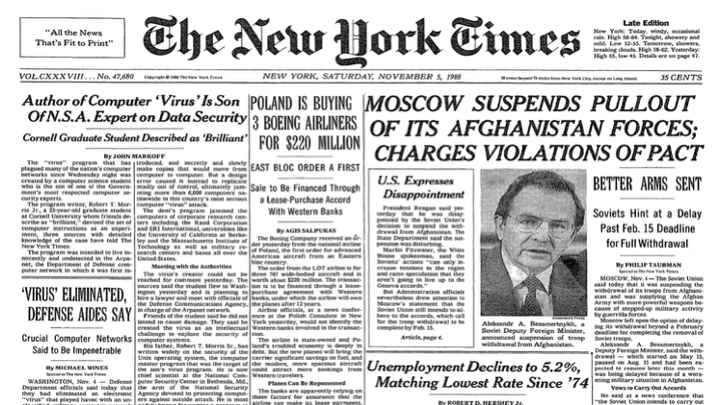 The attack was devastatingly effective. The worm propagated itself onto any system it could successfully log into, and then the process repeated. The incident made front-page news in The New York Times, with a headline declaring “Author of Computer ‘Virus’ Is Son of N.S.A. Expert on Data Security.” The worm infected thousands of systems. While it was not designed to cause harm, it failed to check whether a version of the software was already running on a compromised computer. This caused multiple instances of the software to run concurrently, bringing significant portions of the early Internet to a standstill.